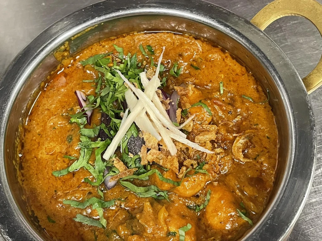 Kokt lamm tillagas i baltisås, toppad med färsk koriander, rödlök och serveras i het järngryta